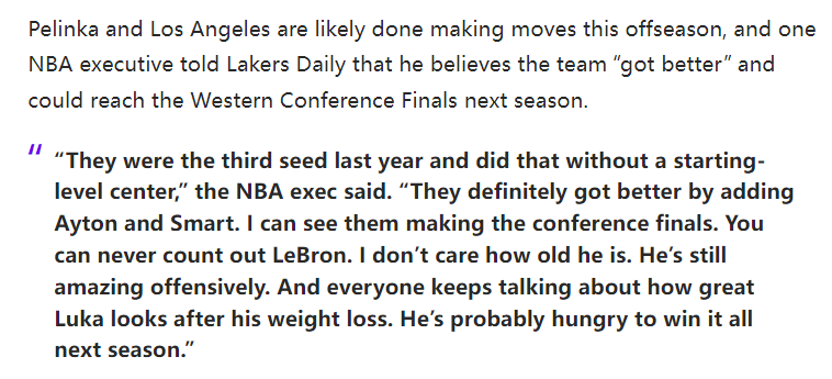 值得一提的是,一位NBA高管接受了美媒Lakers Daily的采访。这位高管认为湖人新赛季有机会杀进西部决赛。